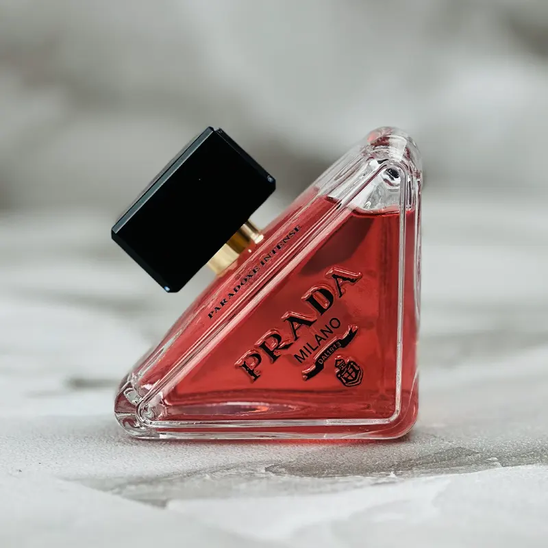 - بطری شیشهای مدرن و لوکس : طراحی مثلثی بطری نمادین پرادا
